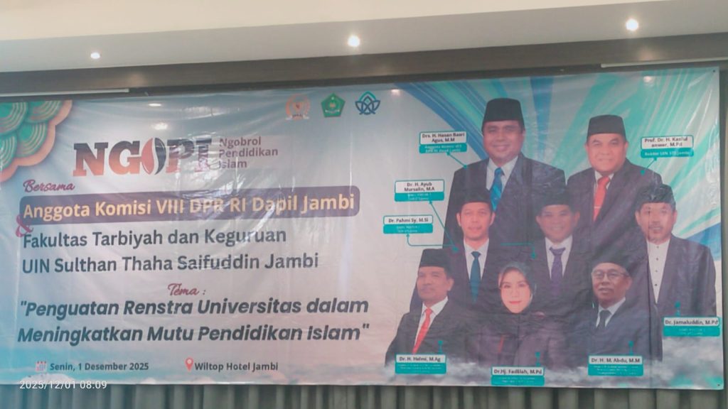 Jambi – Kepala UPT Perpustakaan UIN Sulthan Thaha Saifuddin Jambi, Mohd. Isnaini, S.Pd.I., M.Hum., turut hadir dan mengikuti kegiatan NGOPI (Ngobrol Pendidikan Islam) bersama Anggota Komisi VIII DPR RI Dapil Jambi, Senin (1/12/2025). Acara ini diselenggarakan oleh Fakultas Tarbiyah dan Keguruan UIN STS Jambi dan berlangsung di Wiltop Hotel Jambi.